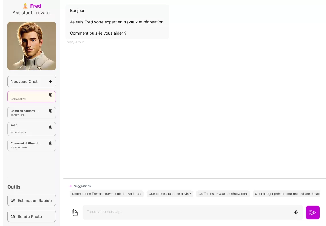 Fred chiffre vos travaux selon votre gamme (entrée, standard, premium), vous guide sur les normes (DTU, sécurité, matériaux) et vous aide à planifier chaque étape. Il parle comme un bon artisan… mais répond instantanément, 24h/24.